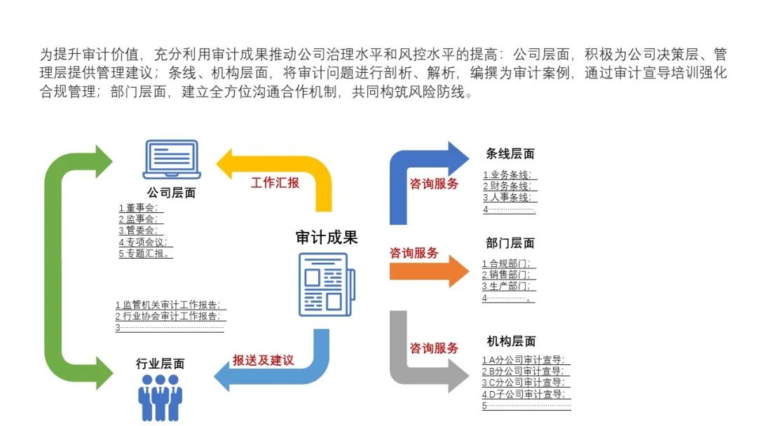 审计成果运用的路径有很多条,最直观的就是从不同的层面开展审计成果运用。如从公司层面、行业层面、机构层面、部门层面、职能条线层面等等。如见下图: